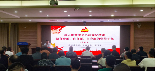 张玉安以《深入贯彻中央八项规定精神 做自身正、自身硬、自身廉的党员干部》为题,从“提高站位、深化认识,准确把握全面从严治党新形势;以案为鉴、查摆剖析,加强对廉政风险的防范和治理;履职尽责、担当作为,推动学校各项事业高质量发展”三个方面,详细阐述了当前全面从严治党面临的新形势,中央八项规定精神的核心要义、精神实质,违反中央八项规定精神的具体表现,以及“由风及腐”“风腐交织”的规律。