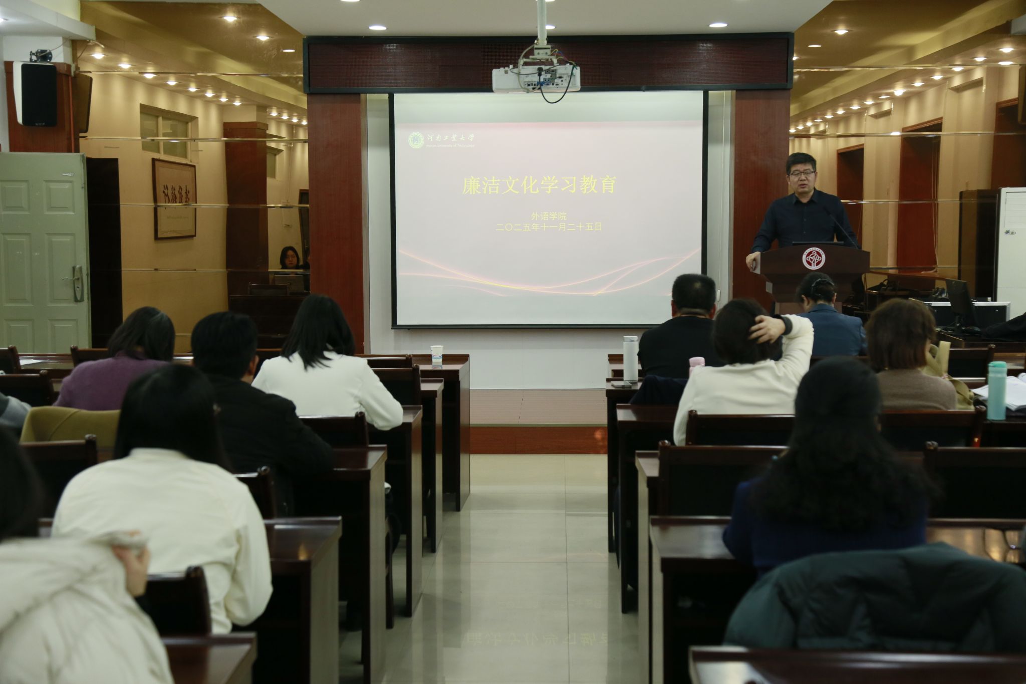 为筑牢全体教职工廉洁从教的思想防线,营造风清气正的育人环境,11月25日下午,外语学院在博闻楼5225会议室召开全体教职工大会,专题开展廉洁文化学习教育。全体教职工参会,会议由院党委书记王云涛主持。