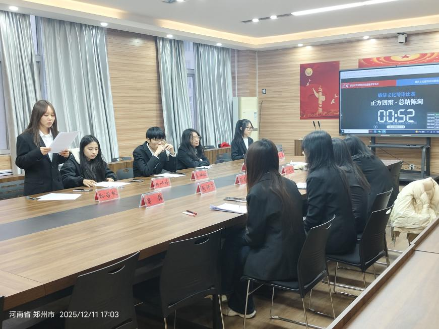 12月11日下午,法学院在博识楼3424会议室成功举办廉洁文化主题辩论赛。本次活动作为学院廉洁文化教育月的组成部分,旨在通过思辨形式深化廉洁教育,深化青年学子对廉洁文化的理解,树立正确的价值观。法学院辅导员吉利出席活动并现场指导。