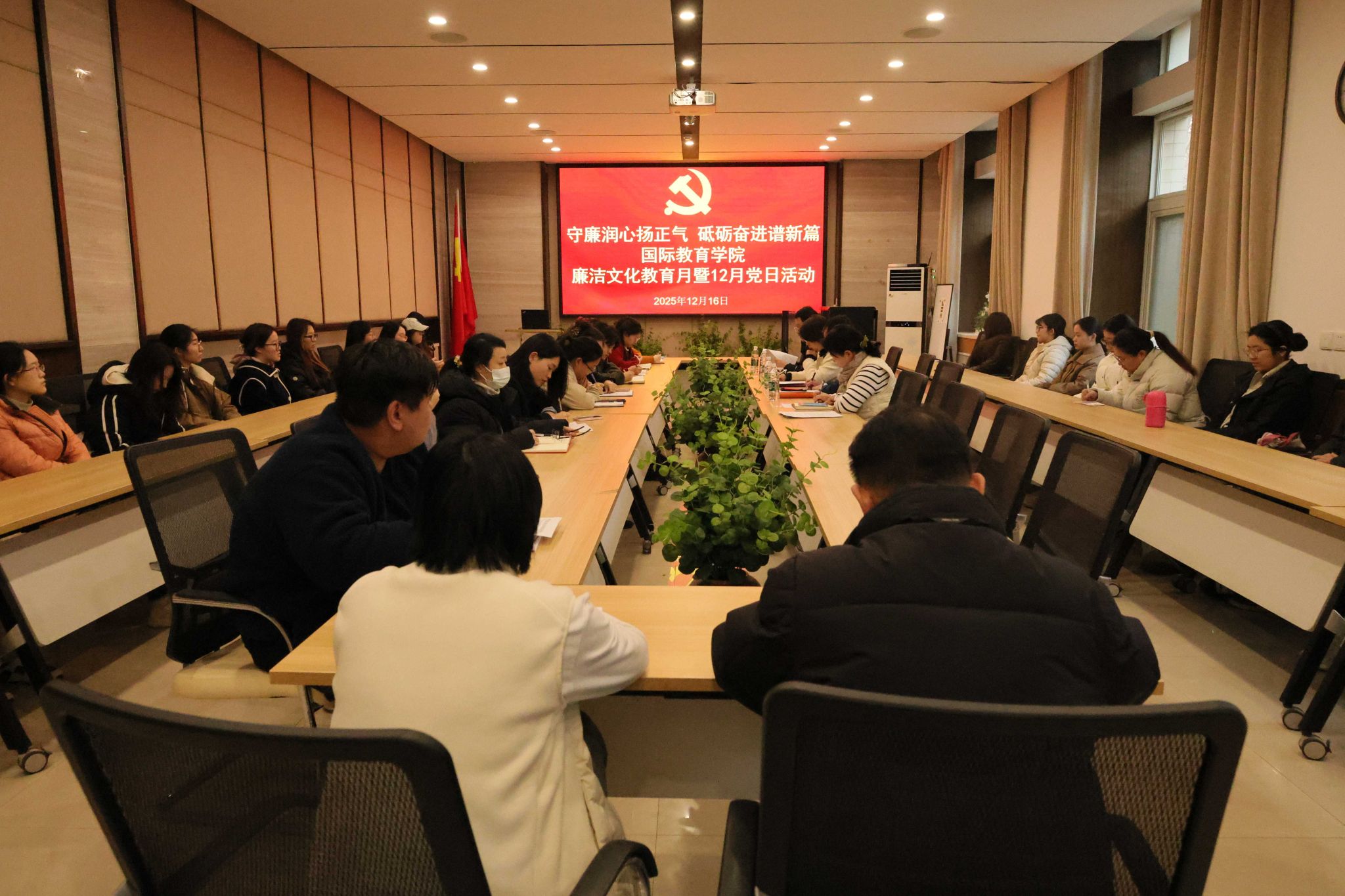 为深入贯彻习近平总书记关于廉洁文化建设和党的纪律建设的重要论述,落实中共中央办公厅《关于加强新时代廉洁文化建设的意见》与省委《关于推进清廉河南建设的实施意见》要求,进一步筑牢校园廉洁文化根基,12月16日,国际教育学院在惟学楼6254会议室举办廉洁文化教育月暨主题党日活动。学院全体教工、学生支部党员代表参会,活动由党委副书记兼纪委书记孙腾主持。