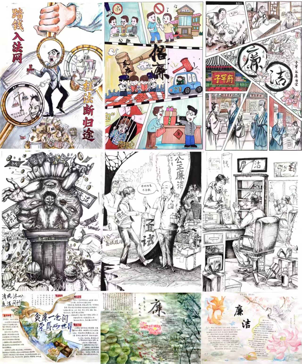 活动践廉树品牌,特色建设提质效。校纪委组织开展一系列廉洁教育主题特色活动,持续擦亮廉洁文化品牌建设。今年,环境工程学院承办的第六届廉洁文化手抄报大赛,共收到来自20个学院的189件参赛作品;设计艺术学院承办的第四届“莲湖清风”廉洁文化设计作品征集活动,共收到来自9个学院的301份作品,其中廉洁文化设计方案167份、漫画作品134份;经济贸易学院承办的第三届教职工廉洁书画摄影大赛共收到10个单位与学院的37件作品,其中书画类作品16件、摄影类作品21件;新闻与传播学院承办的“视廉正行”微视频与“青廉说”廉洁教育微网课活动,共收到来自10个学院的29件参赛作品。此外,各基层党委(党总支)、各单位积极创新形式开展自选动作,强化廉洁文化宣传普及,充分彰显清廉之美、厚植清廉根基,着力营造风清气正的校园廉洁文化氛围。